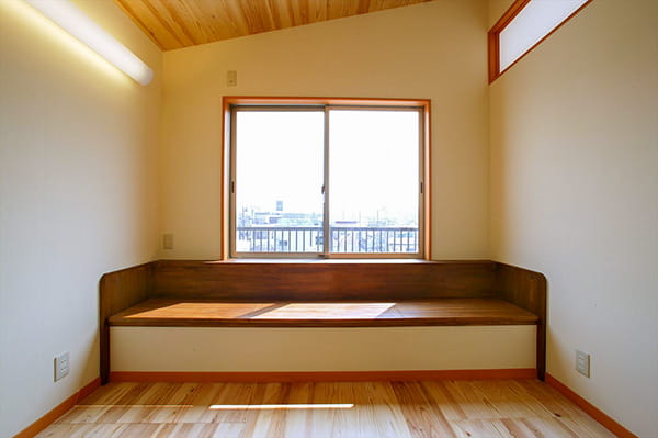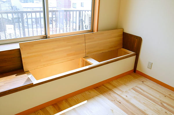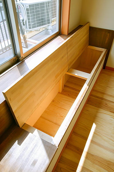 陽当たりの良い窓辺にベンチをオリジナルで造作しました。 フタを開けると、中は収納スペースになっています。