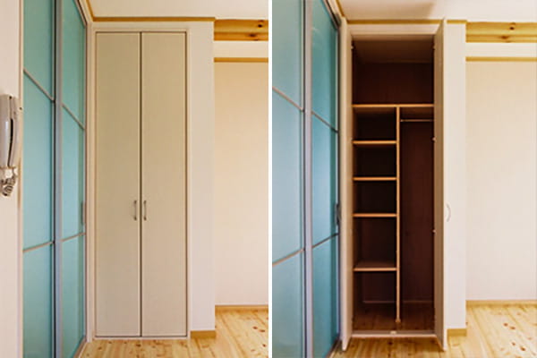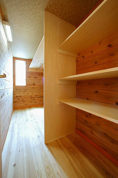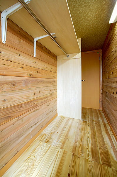 こちらも自然素材にこだわり、床や壁にJパネルを採用しました。Jパネルは調湿性が高いので、大切なお洋服にカビが生える心配もありません。