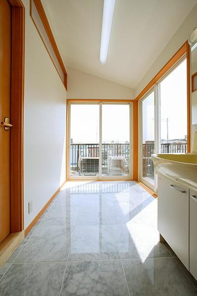 2面がガラス窓になっている、とっても明るいサンルーム。床は大理石を使用して、モダンな風合いに仕上げました。