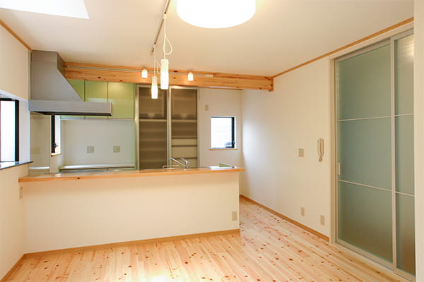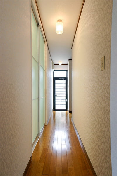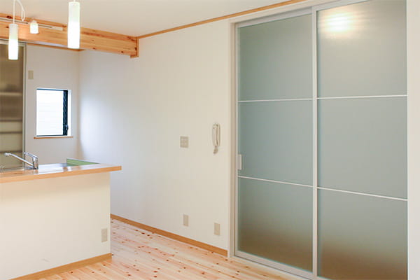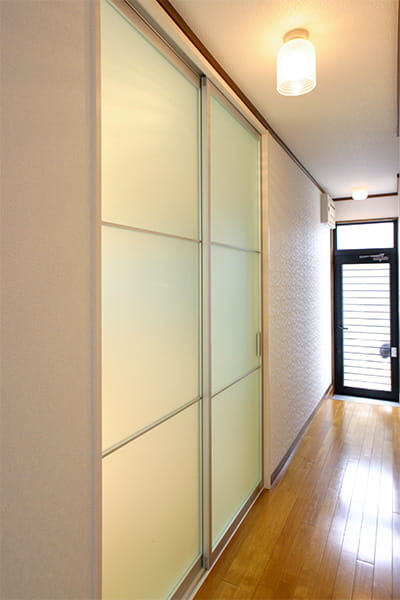 LDKの建具は開き戸でしたが、引き戸にして空間を広く使えるようにしています。 アクリル製の半透明の建具を採用したので、暗かった廊下にも光が届くようになりました。