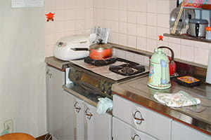 子世帯の浴室・洗面を解体して、壁付けキッチンを対面キッチンに。収納も解体してLDKを広げます。 また、親世帯の和室に掘りごたつを設置したり、洗面室の建具を引き戸に替えるなどの内装リフォームも行います。