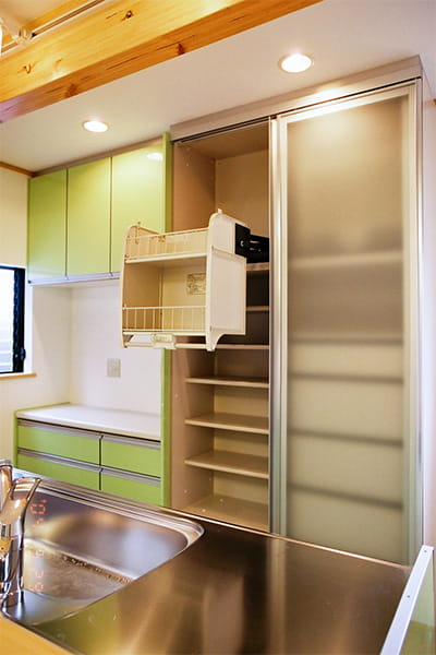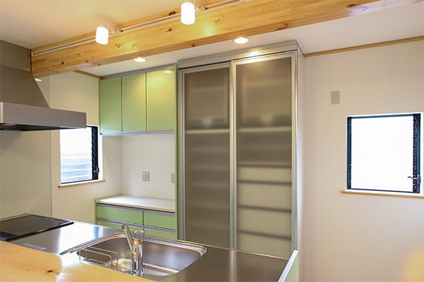 キッチン背面にも大容量の収納を設置して、造り付けの家具以外は置かずに済むように配慮しているので、作業スペースも広く使えます。 これならキッチンのこまごました物も、効率的に収納できますね。