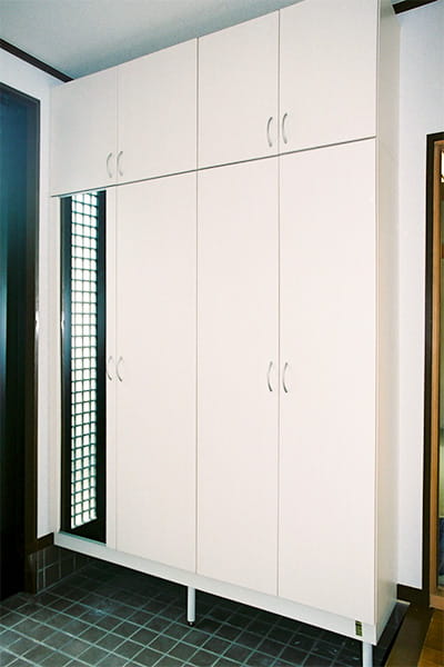 天井まである大きな玄関収納は、しまう物に合わせて造作したもの。 二世帯の家族全員分の靴をまるごとしまえます。