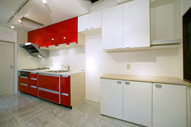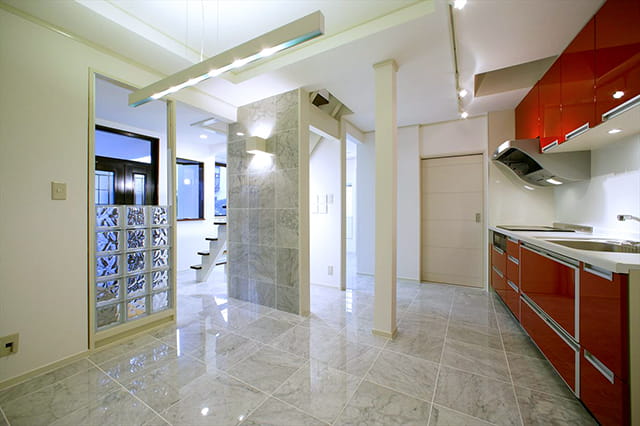 真っ白な空間に真っ赤なキッチンが映え、大理石の床をひき立てています。