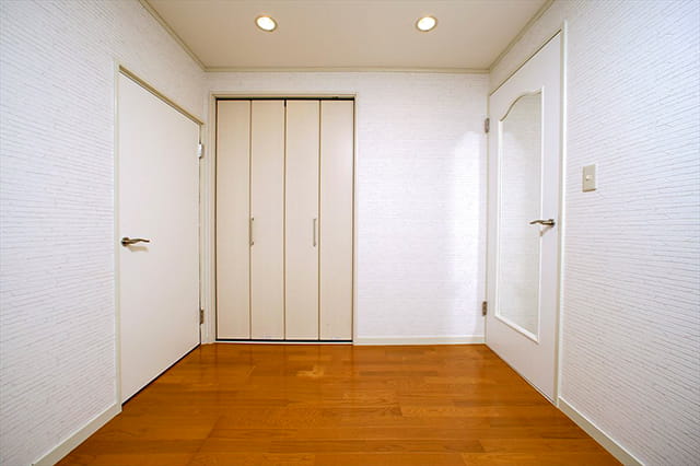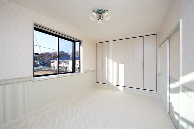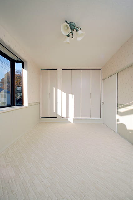 ホワイト系の床・壁・天井に、クローゼットの建具も白をコーディネート。 明るく清潔感のあるお部屋に仕上がりました。