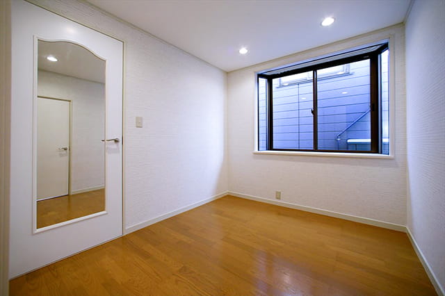 2部屋続きになっている洋室は、床をフローリングに張り替えました。 真っ白な間仕切り扉には鏡がついていて、空間がより広く感じられます。 もちろん、身支度を整えるのにも便利です。