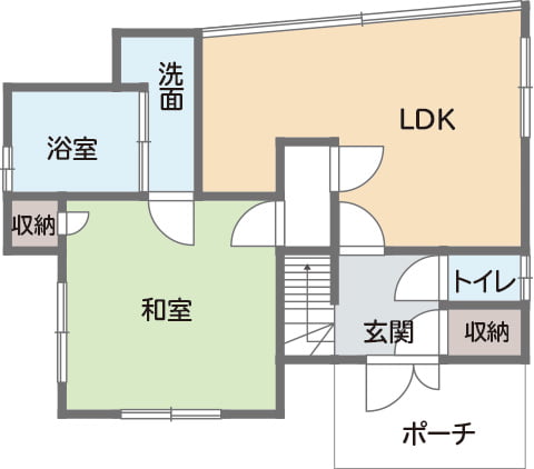 1階は和室とLDKをつなげて、広々とした大きなLDKにします。中央にある階段に工夫を加え、空間につながりをもたせました。