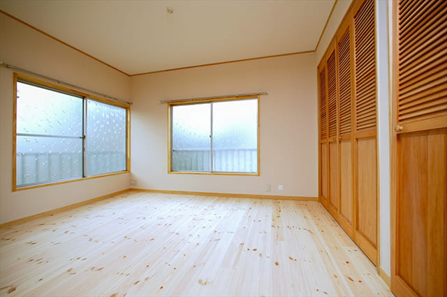 もう一つの和室も洋室にリフォームし、プライベートルームとして使われます。 LDKと同じパインの無垢フローリングで、自然素材たっぷりのお部屋になりました。