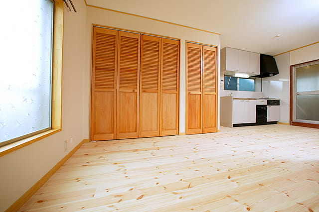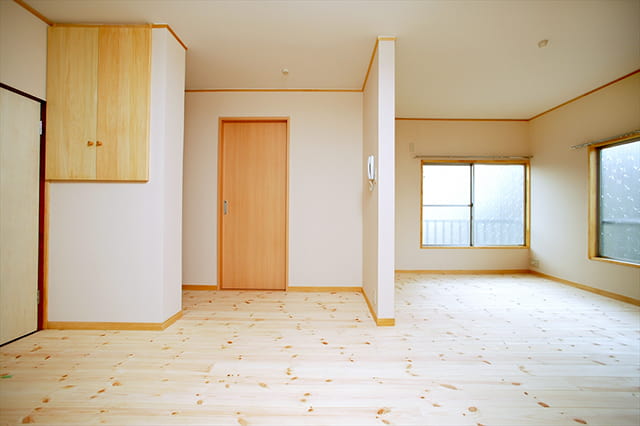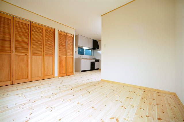 床は一面、明るい色合いのパイン材で、やさしく温かな木のぬくもりが感じられます。 壁には真っ白なクロスを張り、お部屋がより広く見えますね。