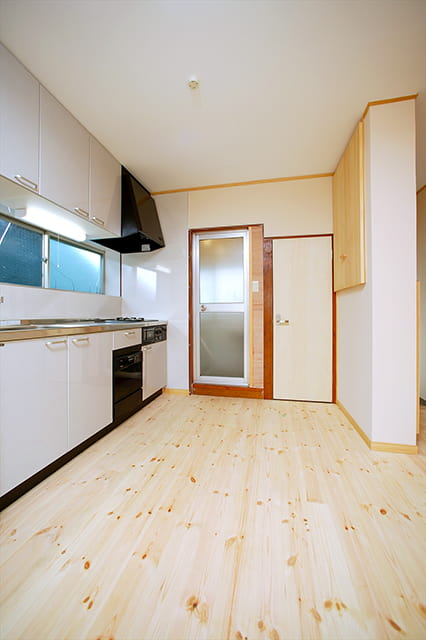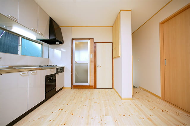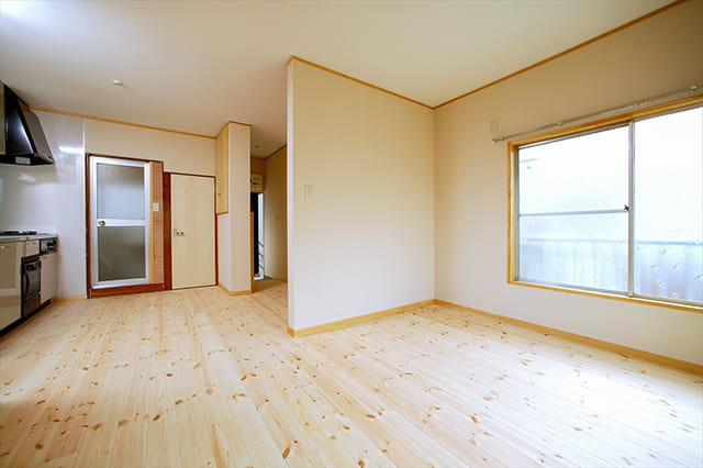 6畳の和室と、6畳のダイニングキッチンの間にあった間仕切り壁を取り壊し、ひとつながりの大きな空間になりました。 リフォーム前とは見違えるほど、明るくてオープンなお部屋に仕上がっています。