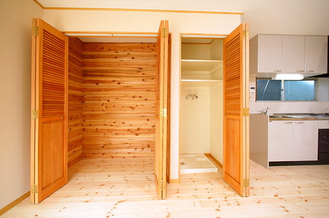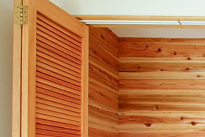 和室の押入れをクローゼットにリフォームしました。 クローゼット内部に張られた杉材は、湿気やカビを防ぐ効果もあります。