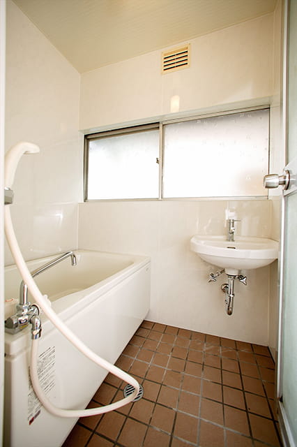 洗濯機が置かれていたところには洗面台を設置しました。 床のタイルも新しいものに変えて、明るい印象の浴室になっています。