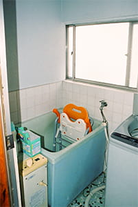 浴室の広さはそのままですが、ゆったりスペースに生まれ変わりました。 バランス型風呂釜をノーリツ製「ガスふろ給湯器バスイング」に変え、壁の中に収めたので、浴槽を大きくできたのです。