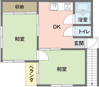 リフォーム前は2DKの間取りでした。 今回、ダイニングキッチンと和室の間の間仕切りを撤去してゆるやかにつなげ、L字型の大きなリビングダイニングキッチンへとリフォームします。