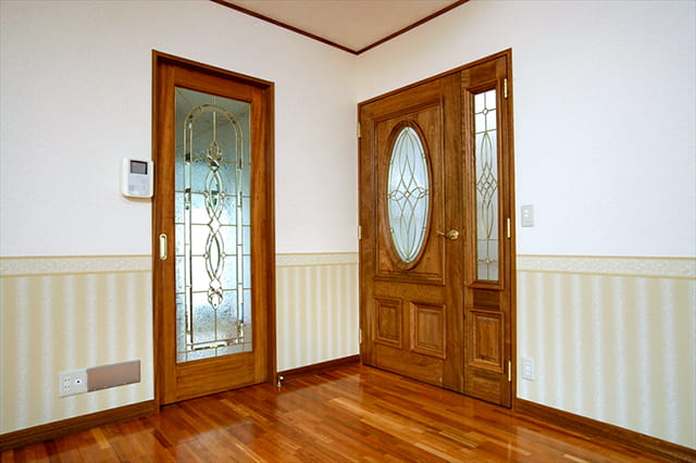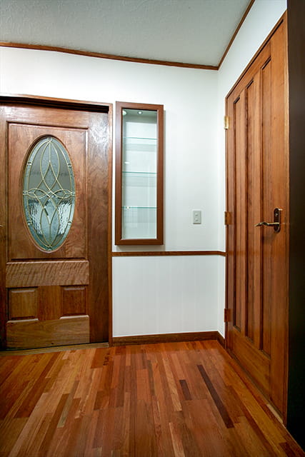 玄関の床もケンパスの無垢フローリング。濃い色目の床材が引き立つよう、ホワイトのクロスを選びました。 建具は自然塗料のリボスで仕上げ、高級感のある玄関ホールになっています。