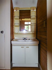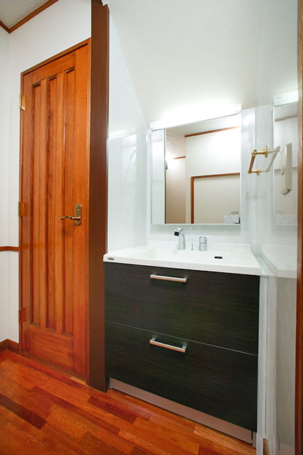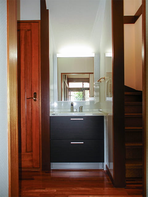 洗面化粧台もキッチン同様、ヤマハ(現トクラス)製です。 オープンスペースに置かれるため、インテリア性の高い洗面化粧台を選ばれました。 シックな雰囲気で、空間に溶け込んでいます。