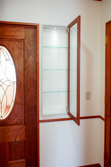 廊下の先には、壁の厚みを利用して飾り棚(ニッチ)を造りました。 中にはダウンライトを設置して、中のアイテムを明るく照らします。お客様の目線も自然にニッチに向かいます。