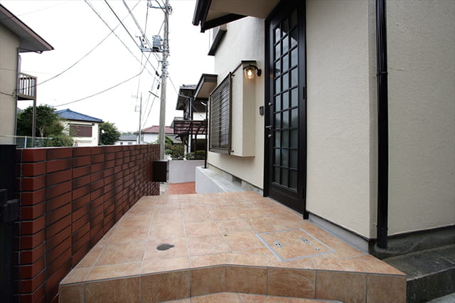 外階段にはテラコッタタイル、塀にはレンガ風タイルを使って、エクステリアもおしゃれにリフォームしました。