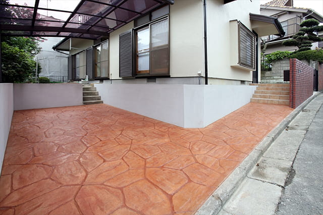 駐車スペースには耐久性が高い「スタンプコンクリート」を採用。 コンクリートが柔らかいうちに着色と成型を行う工法で、日本ではポピュラーではありませんが、アメリカでは人気なのだそうです。
