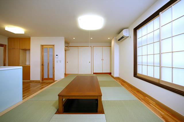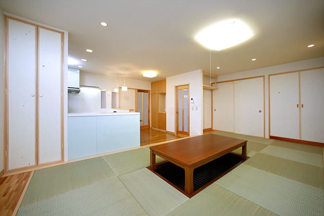ダイニングキッチンとの一体感が感じられるよう、縁のない琉球畳を採用しました。