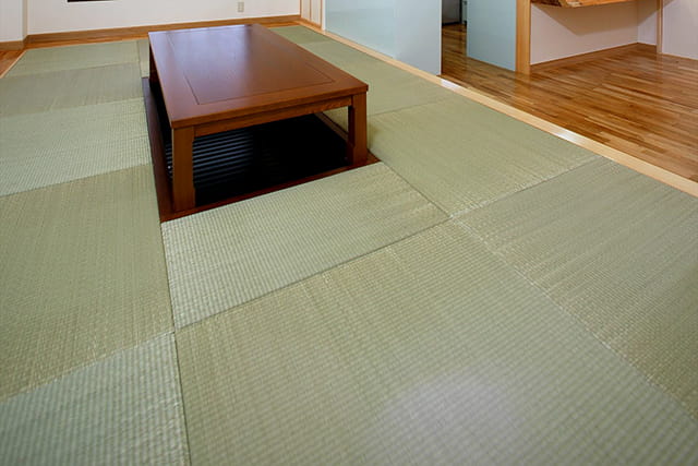 琉球イグサを原料とする琉球畳は、非常に丈夫で耐久性に優れています。 洋の空間にも馴染みやすい琉球畳は人気があり、こちらのお部屋も、和と洋が調和したくつろぎの空間となっていますね。