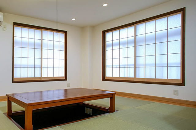 ご年配になると畳の和室の立ち座りは脚への負担が大きくなりますが、掘りごたつがあれば安心です。 色の濃い天然木のテーブルが、良いアクセントになっています。