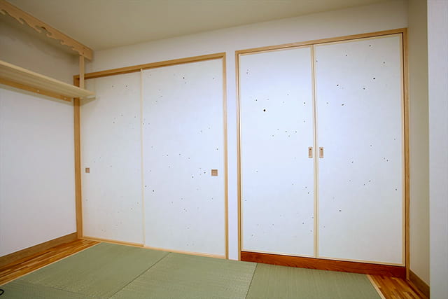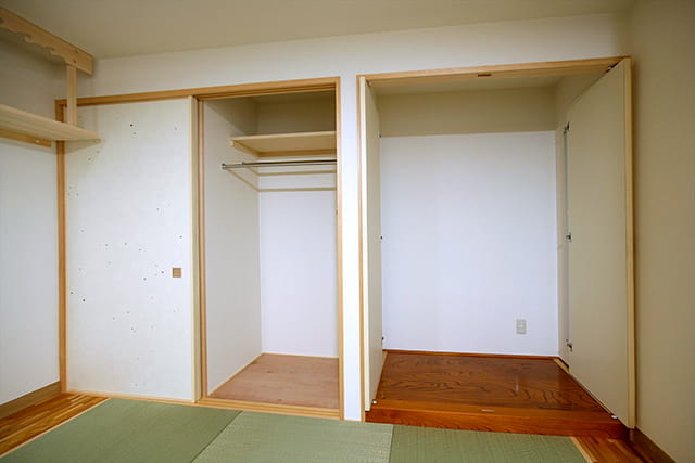 また、お洋服を収納できるクローゼットと、お仏壇を収納できるスペースを造り付けました。 お仏壇の扉は、両脇にスライドさせて収納できるので、開けた時に邪魔になりません。 機能的な収納ですっきりお暮らしいただけます。