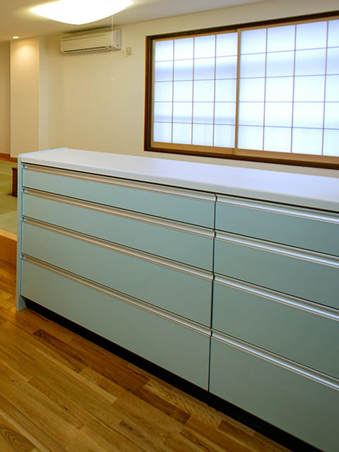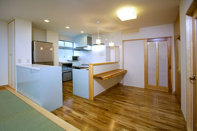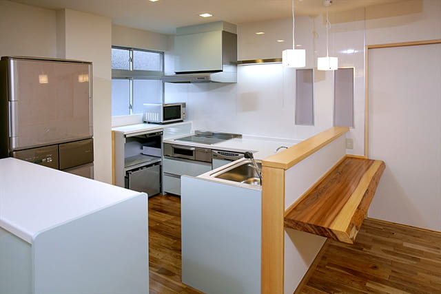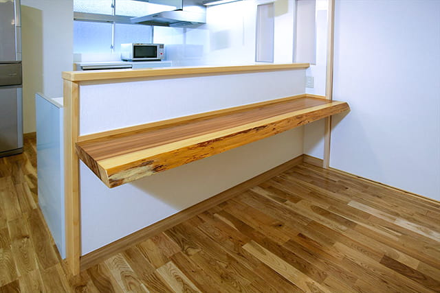 キッチンにはカウンターも設け、配膳や後片付けが楽に。忙しい朝などはカウンターで手軽に朝食をとることもできますね。 カウンターには、和歌山から取り寄せた無垢板を採用し、インテリアのバランスも良くなりました。 年を経るごとに味わいのある色に変わっていくのも楽しみです。