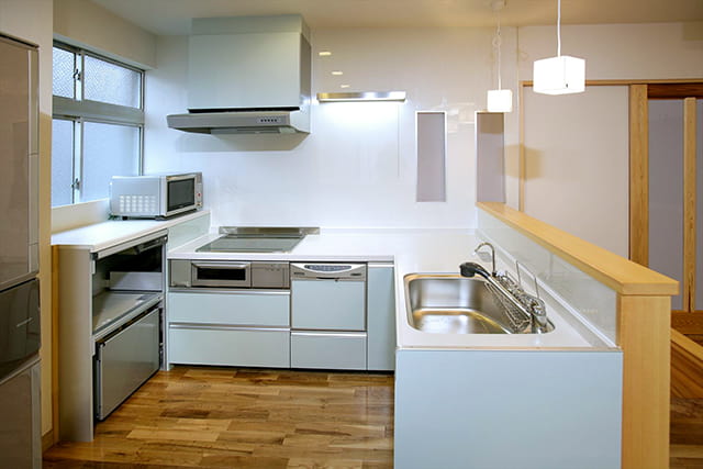 キッチンスペースはコの字型の配置で、コンパクトな作業動線を実現しました。無駄な移動をすることなく、効率良く調理ができます。