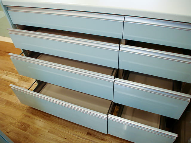 キッチンには、引き出し式の置き型収納を設置しました。 設置スペースは必要になりますが、置き型収納は吊戸棚よりも物を出し入れするのが楽で、奥までたっぷり使えます。 ふだん使いの食器類をすべてしまえる収納力です。