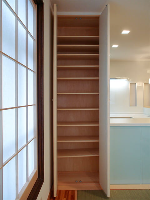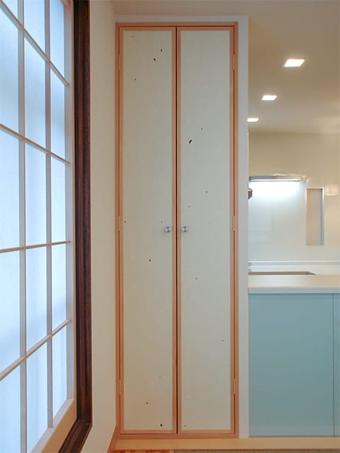 天井までの高さの収納は、和のリビング側から使う形になっています。 お客様用の食器や季節の器をしまえるように計画したもので、地震の際に不意に扉が開くのを防ぐ耐震ラッチが取り付けられています。 扉には模様入りの襖を使って和風に仕上げました。