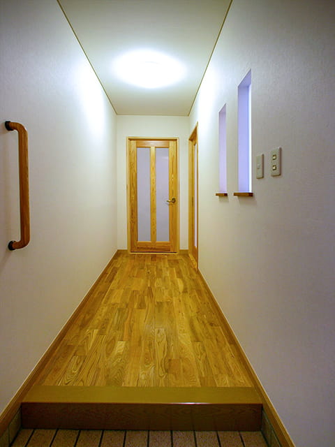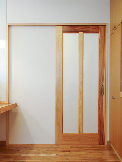 玄関とLDKとの境は、省スペースな引き戸に替えて、軽く開け閉めできるようになりました。 半透明のポリカーボネイトがはめ込まれていて、こちらも玄関へLDKの光を届ける工夫がされています。