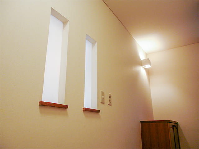 リフォーム前は玄関が暗く、昼間でも電気をつけていたそうですが、LDKの光を取り込むための工夫として、飾り棚を2つ設置しました。 飾り棚の奥の壁を半透明にすることで、光を取り込めるようにしたのです。
