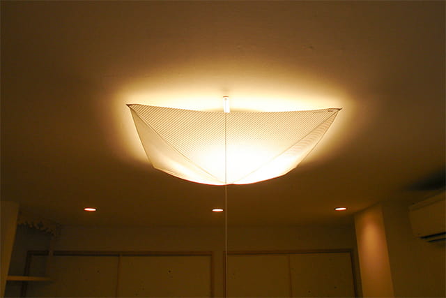 和風モダンなインテリアを意識して、インテリアコーディネーターが照明をコーディネートしました。 和紙を使った照明や、柔らかな明かりのペンダントライトなど、空間にぴったり合うものをお選びしています。