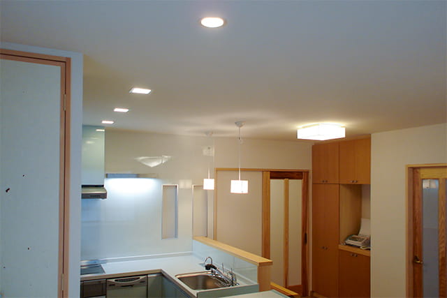 LDKの広い天井は、ゾーンごとに分けて照明を設置し、平坦な印象を与えません。 お部屋の隅々まで明るく照らせるように、補助としてダウンライトも取り付けました。