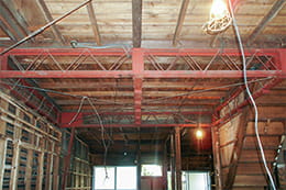 解体後の天井の様子です。店舗部分は鉄骨を使用してしっかりと造られていました。赤い部分が鉄骨のトラス梁です。