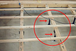 「プラ束」と呼ばれるプラスチックの床束(ゆかづか)で補強してから、ヒバの土台と大引を入れました。