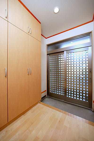 1階のほとんどのスペースが店舗でした。建物に向かって右側に玄関を新設し、中にはトールサイズの玄関収納を設けました。 たっぷりサイズの玄関収納には、傘やブーツ、コートもしまえます。