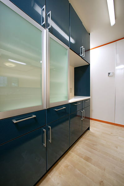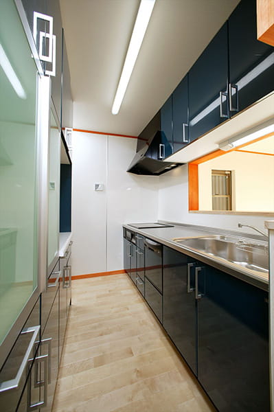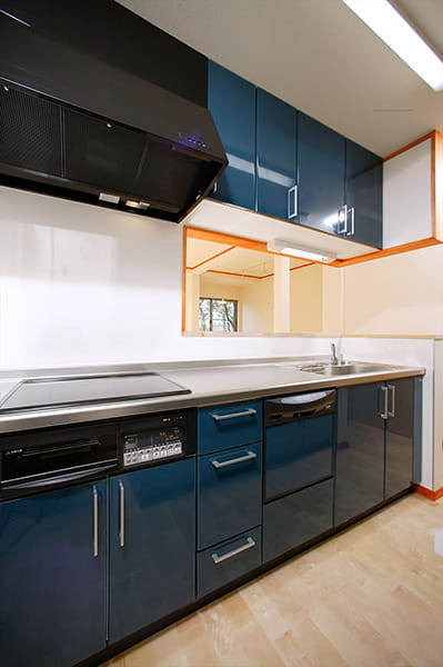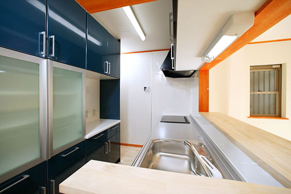 落ち着いたブルーのシステムキッチンがお部屋のアクセントカラーとなり、とてもモダンな雰囲気です。 カウンターは無垢材で造作しました。