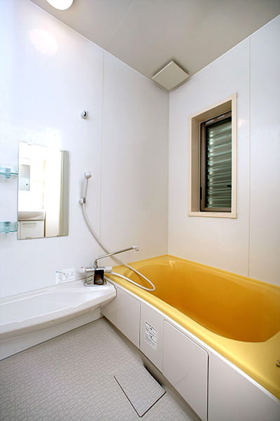 浴室はイエローの浴槽で、とてもかわいらしく仕上がっています。 リラックスして入浴を楽しめそうです。