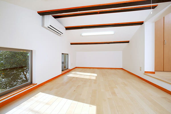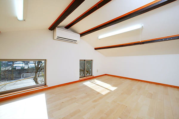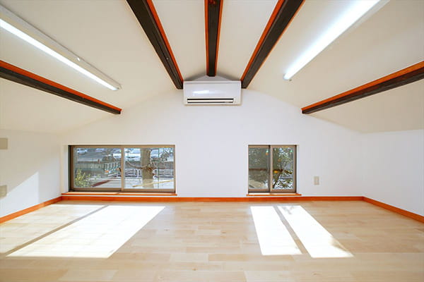2階は小さな窓が1つしかなく、少し暗いお部屋でしたが、光がたくさん差し込むように窓を増やし、明るい清潔なお部屋に変身です。 吹き抜けで、天井の梁がアクセントになっています。