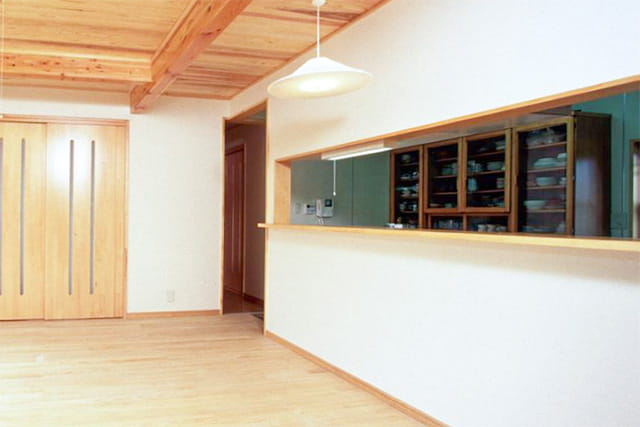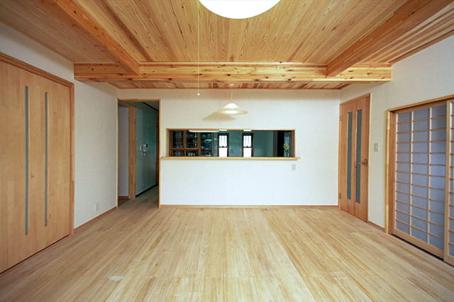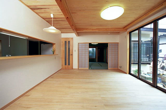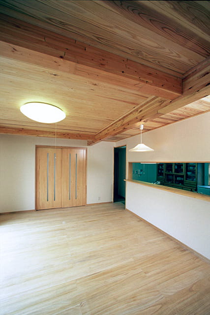 天井は、ベイマツの梁をあらわしにして高さをとり、天竜杉の仕上げ材「縁甲板(えんこういた)」を張りました。