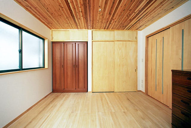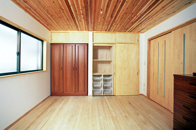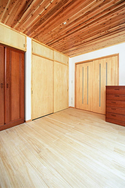 LDKの隣に新しく造った洋室は、寝室として計画しました。お洋服をたくさんお持ちなので、壁一面を収納スペースにしています。 左側のスペースには愛用のタンスをはめ込み、右側は収納を造作しました。