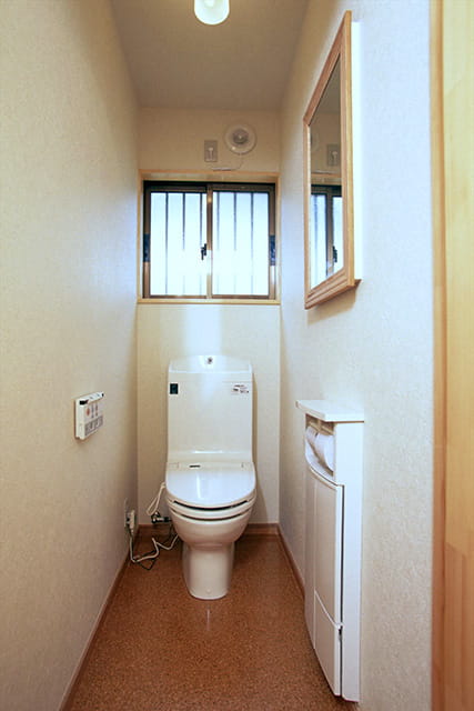こちらのトイレはしっかり断熱し、床はコルクタイルにしたので、夜間でも安心して使えます。
