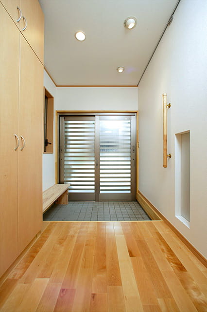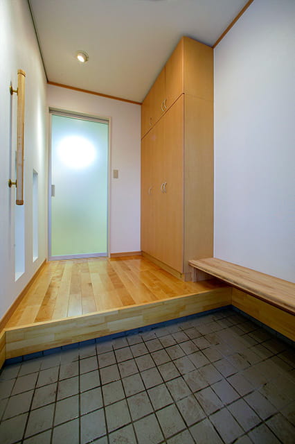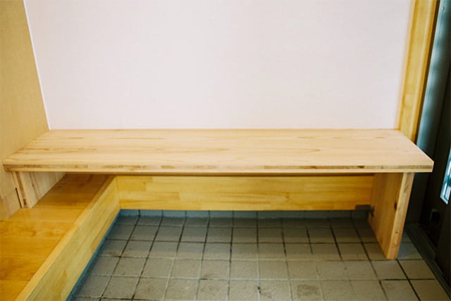 また、ご高齢になっても使いやすいよう、玄関にベンチを造作しました。 靴を履くときに腰かけたり、ちょっと荷物を置いたりするのに便利です。立ち寄られたお客様にも座っていただけますね。