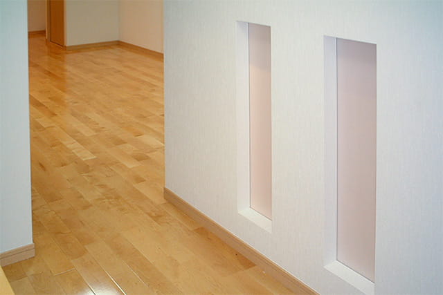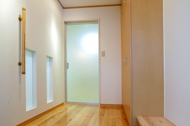 光を通す玄関引き戸や半透明の建具を採用し、室内窓を設けて、お部屋の中まで光を取り込めるようになっています。