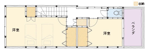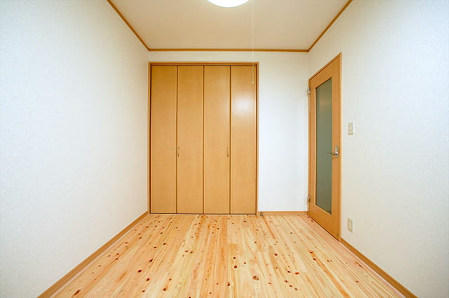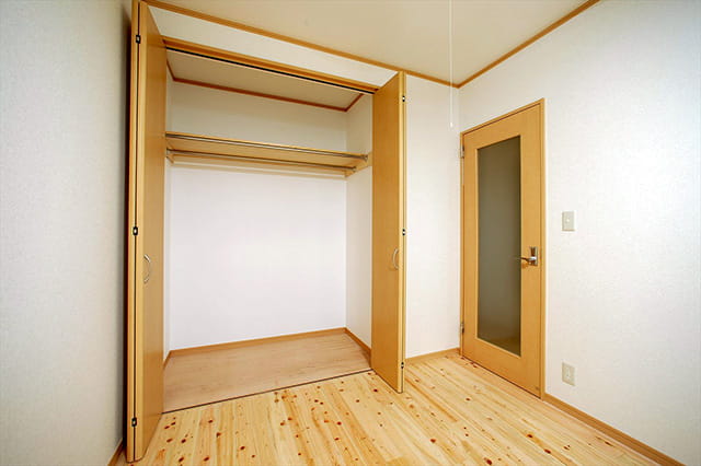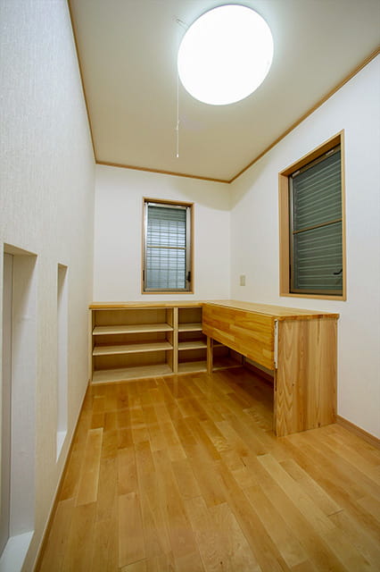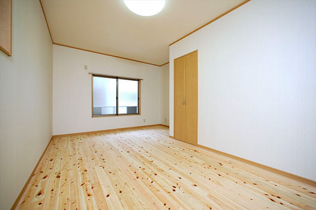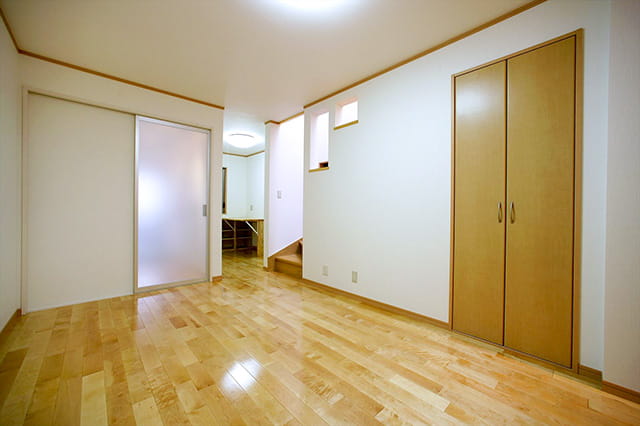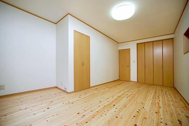 2階の2つのお部屋には、ヒノキの無垢フローリングを採用。造り付けの収納もたっぷり計画しました。 2階にもトイレを新設したので、夜間でも安心して過ごせます。