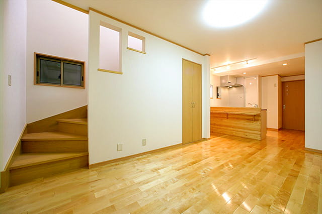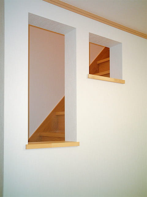 階段横にスリットをつけてオープンにすることで、お部屋を明るく演出しています。 2階からの光が差し込むので、窓がないとは思えないくらい明るいお部屋になりました。