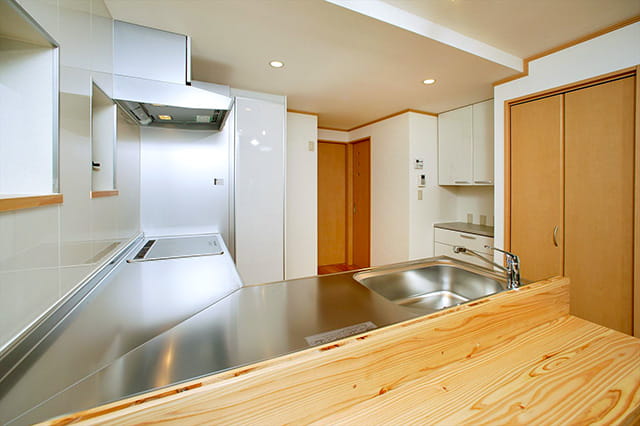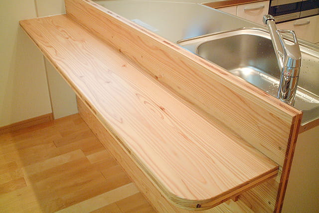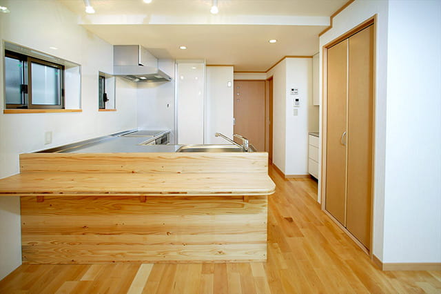 キッチンカウンターは無垢の徳島杉を使用したJパネルで造作しました。 Jパネルは3層クロスパネルの集成材で、断熱性・調湿性・吸音性に優れています。
