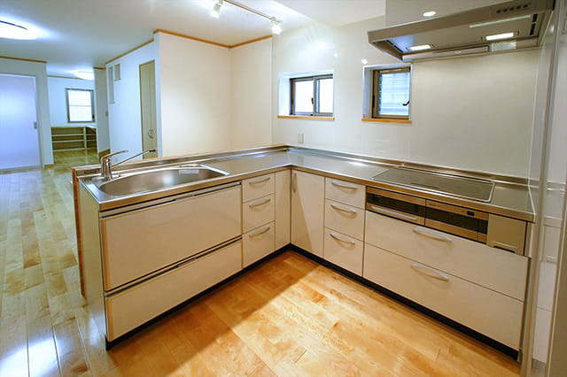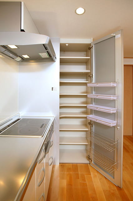 キッチン収納は背面収納も含めてたっぷりご用意しました。動線も考慮して、使いやすくお料理しやすいキッチンになりました。